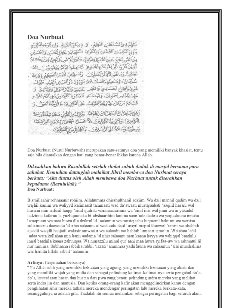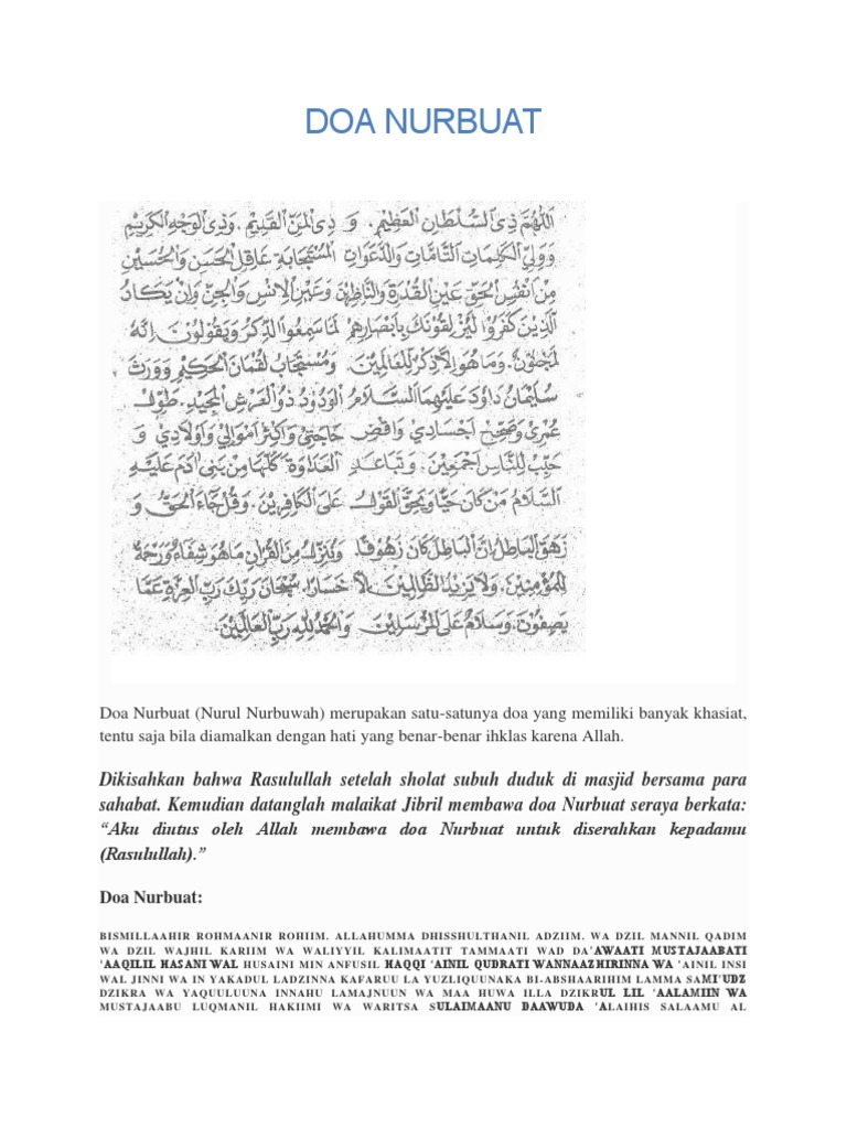 Doa nurbuat agung. Ya allah robb yang memiliki kekuatan yang agung yang memiliki kemauan yang abadi dan yang memiliki wajah yang mulia dan sebagai pelindung kalimat kalimat nya serta pengabul doa doa kecerdasan hasan dan husein dari jiwa yang benar pelindung indra mereka yang melihat serta indra jin dan manusia. Kemudian datanglah malaikat jibril seraya berkata. Doa nurbuat doa nurbuat atau sering juga disebut doa nubuwwah adalah salah satu doa yang memiliki banyak manfaatnya.